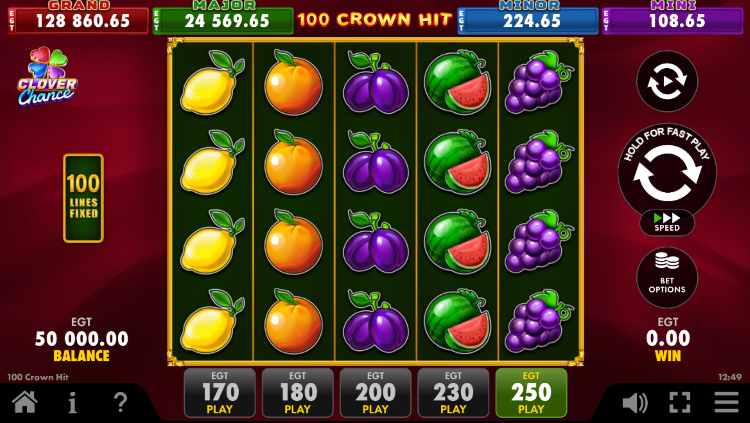 De 100 Crown Hit slotmachine is aangesloten op het Clover Chance jackpotnetwerk. Dit betekent dat je tijdens het spelen van deze fruitmachine kans maakt op één van de vier progressieve jackpots (Mini, Minor, Major en Grand). De Jackpot Feature kan op geheel willekeurige momenten geactiveerd worden. Lukt het je om deze feature te triggeren? Dan krijg je een Pick & Click game voorgeschoteld met 15 kistjes.
