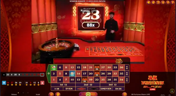 88 Fortunes Blaze Live is gebaseerd op de videoslot 88 Fortunes van Light & Wonder. Het oosterse thema uit de videoslot komt ook in de live roulette versie duidelijk naar voren. De live studio is aangekleed met prachtige rode gordijnen en gouden details geven het geheel een sfeervolle uitstraling. Er wordt gebruikgemaakt van oosterse geluksmunten en personages uit de videoslot komen ook in de vormgeving van het live spel terug. Wie de videoslot kent, zal dus zeker veel herkenning vinden in het live casino spel van Live and Wonder Live.