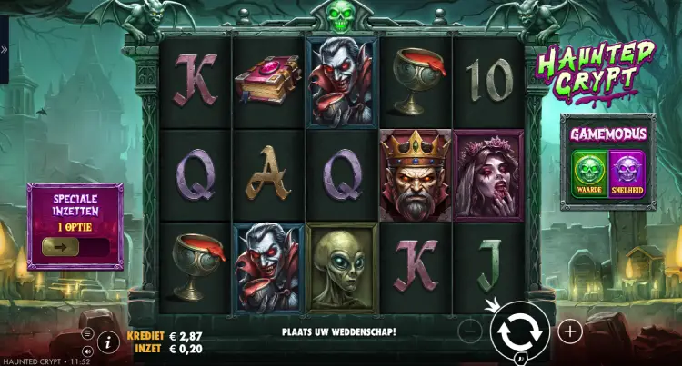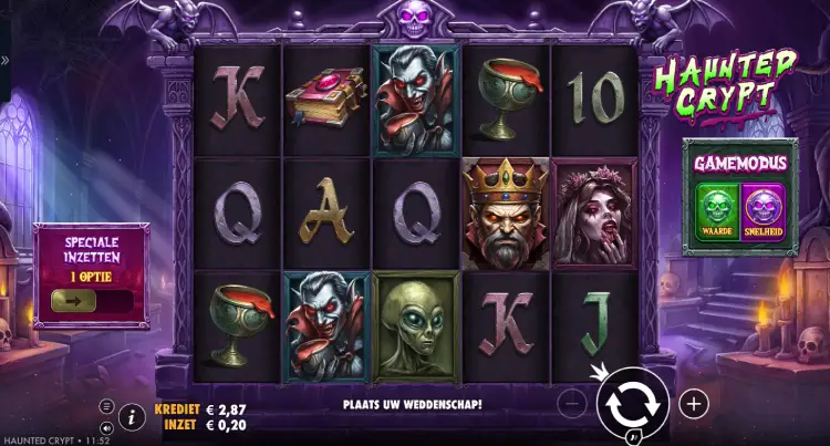 Je kiest in deze gokkast uit twee verschillende speelopties: Waarde en Snelheid. Wie voor Waarde kiest, moet gemiddeld genomen wat langer wachten op een free spins ronde. Die ronde levert gemiddeld dan wel wat meer op. Wie voor Snelheid kiest, zal de free spins sneller gemiddeld triggeren, maar die ronde levert dan gemiddeld juist minder op. Hierdoor kan je Haunted Crypt op je eigen speelstijl aanpassen.