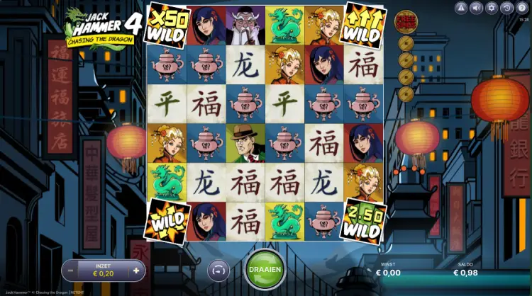 Jack Hammer 4: Chasing the Dragon is, zoals de titel al zegt, het vierde deel van de Jack Hammer serie van game provider NetEnt. Ook in dit deel van de serie probeert de detective Jack Hammer een misdaad op te lossen. Het geliefde sticky wins mechanisme uit eerdere delen is ook weer aanwezig. Daar komen in dit spel een cluster pays mechanisme, verschillende wild features en een hold ‘n win bonusronde bij. Op die manier maak je in Jack Hammer 4: Chasing the Dragon kans op maximaal 10.000x je inzet per spin.