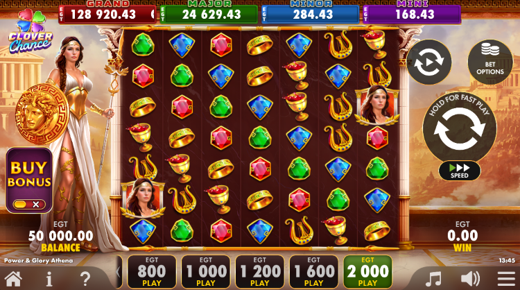 Voor Power & Glory Athena liet EGT Digital zich duidelijk inspireren door het populaire Gates of Olympus. De casino game met Griekse mythologie thema heeft praktisch dezelfde look & feel, bevat Cascades en een free spins met Bonus-Buy. Duidelijke verschillen zijn er ook; zo werkt Power & Glory Athena middels Cluster Pays en maak je hier kans op progressieve jackpots. Het maximale winstpotentieel staat vast op 5.000x de inzet.