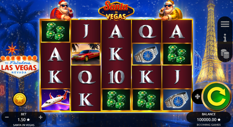 Santa In Vegas is een hoge variantie 5x4 video slot met een theoretisch uitbetalingspercentage van 95.6%. De setting van deze kerst-installatie is de stad Las Vegas. De avond is gevallen en de Strip wordt verlicht door lantaarns en de welbekende Eiffeltoren. Sneeuwvlokjes dwarrelen langzaam naar beneden terwijl de kerstman nog even op zijn pokerface oefent.