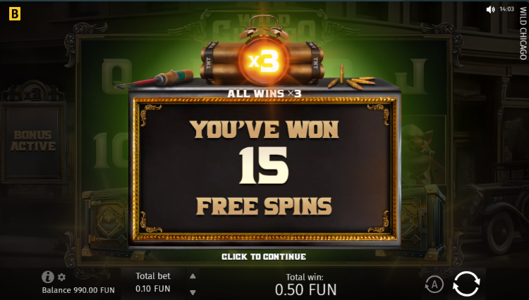 Met 3,4 of 5 kluizen (scatters) op de rollen ga je naar de Free spins bonus van de Wild Chicago casino game. Je kunt de kluis op elke rol tegenkomen. Extra fijn is dat de scatter ook een mooie uitbetaling oplevert van 2 (bij 2 stuks) tot 500 maal de inzet. De maffia dieren verplaatsen zich naar een grote kluis vol waardevolle items en bieden jou 15 gratis spins aan. Het is mogelijk om je saldo van free spins aan te vullen. Dit doe je door tijdens de feature opnieuw 3 of meer scatters te landen. Het triggeren van de free spins bonus van de Wild Chicago gokkast is ab-so-luut de moeite waard om de volgende redenen: jouw free spins winsten worden standaard verdriedubbeld. Wauw!