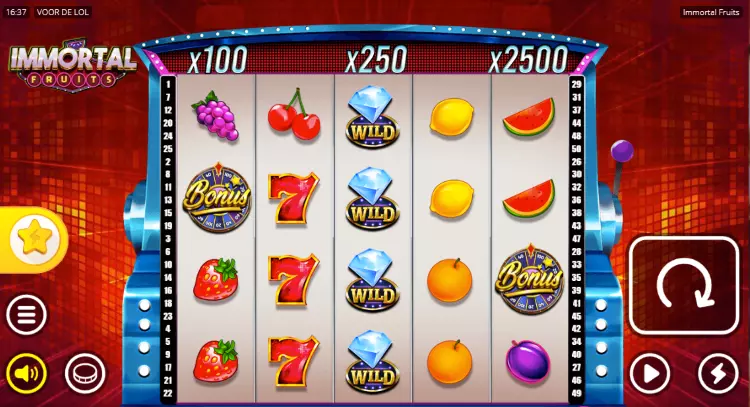 Nolimit City staat bekend om zijn video slots die tjokvol enerverende features zitten. Met Immortal Fruits laat de spelontwikkelaar echter zien dat ze ook uitstekende fruitmachines kunnen maken. Op de 5 rollen loop je watermeloen, kersen, citroenen en aardbeien tegen het lijf. De rode zeven is het meest lucratieve symbool. Er is ook een wild in het spel in de vorm van een diamant. De hoofdattractie van Immortal Fruits is de xWheel Feature. In deze feature maak je kans op één van de drie jackpots met respectievelijke waarden van 100x, 250x en 2500x de inzet. Bij 711 Casino kun je de game spelen voor echt geld.